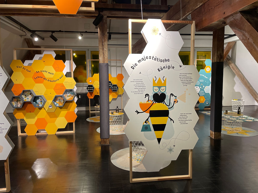 Durch vielfältige Module, die nach dem Mehr-Sinne-Prinzip gestaltet sind, können die Besucher*innen in die Bienenwelt eintauchen. Die Sonderausstellung vom 14.12.22 bis zum 14.12.23 präsentierte eine interaktive Entdeckungsreise, sowohl für Kinder als auch Ihre erwachsenen Begleiter*innen, die interessante Aspekte dieser außergewöhnlichen Tiere in unserem Ökosystem mit allen Sinnen erfahrbar macht.